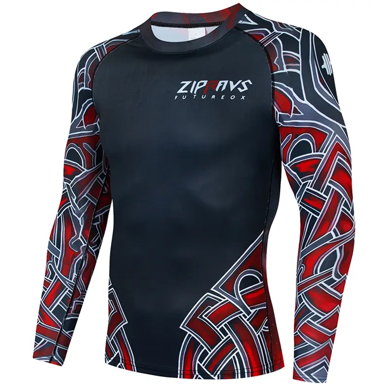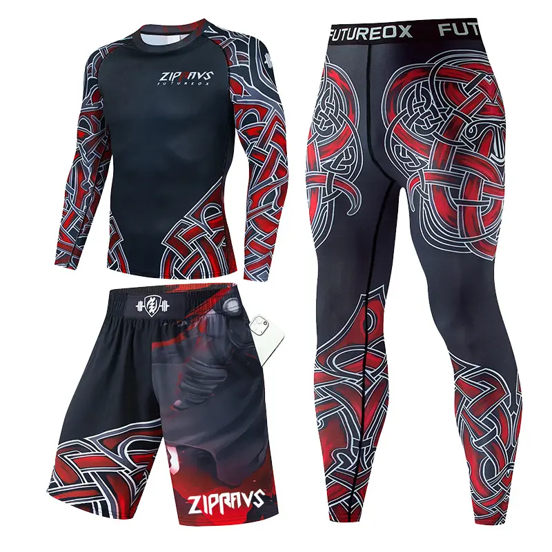 Рашгард, тайтси та шорти чорного кольору з червоним та сірим геометричним принтом. Тайтси з широким поясом. Костюм компресійний чоловічий RedZip шиється зі швидковисихаючої компресійної тканини. Підходить для силових видів спорту, а також для фітнесу, бігу, єдиноборств та інших. У комплект входять шорти, тайтси та рашгард.