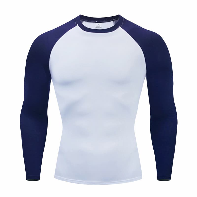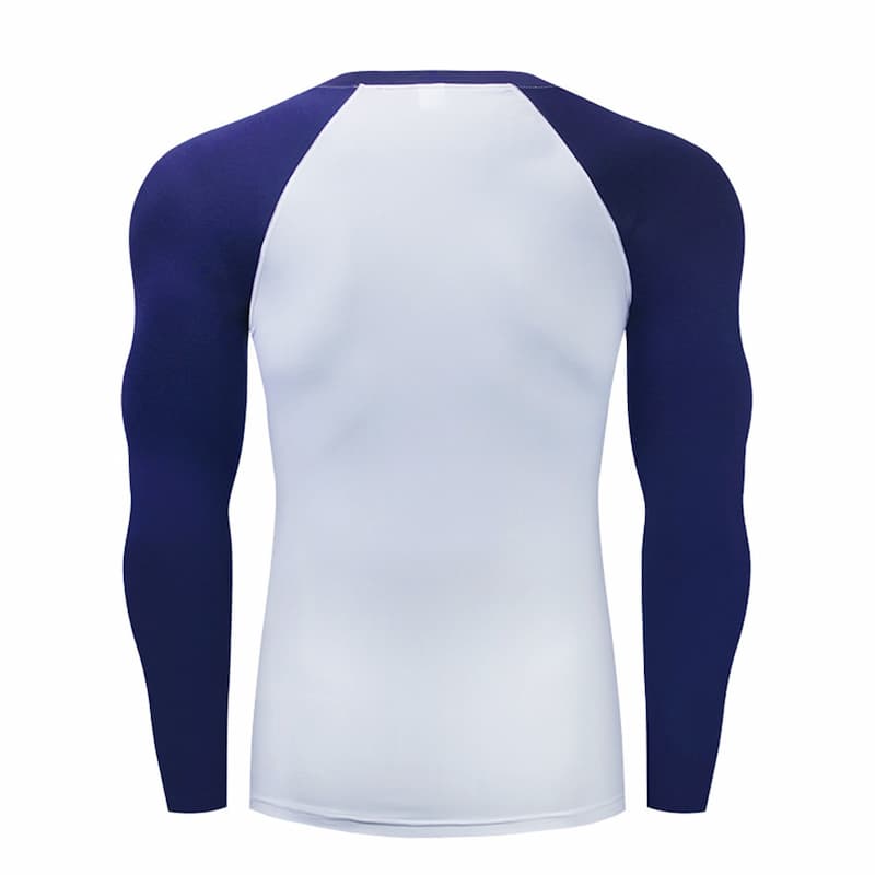 Рашгард чоловічий спортивний білого кольору із синіми рукавами, для занять активними видами спорту. Рашгард чоловічий спортивний біло-синій шиється зі швидковисихаючої облягаючої тканини з легким компресійним ефектом.
