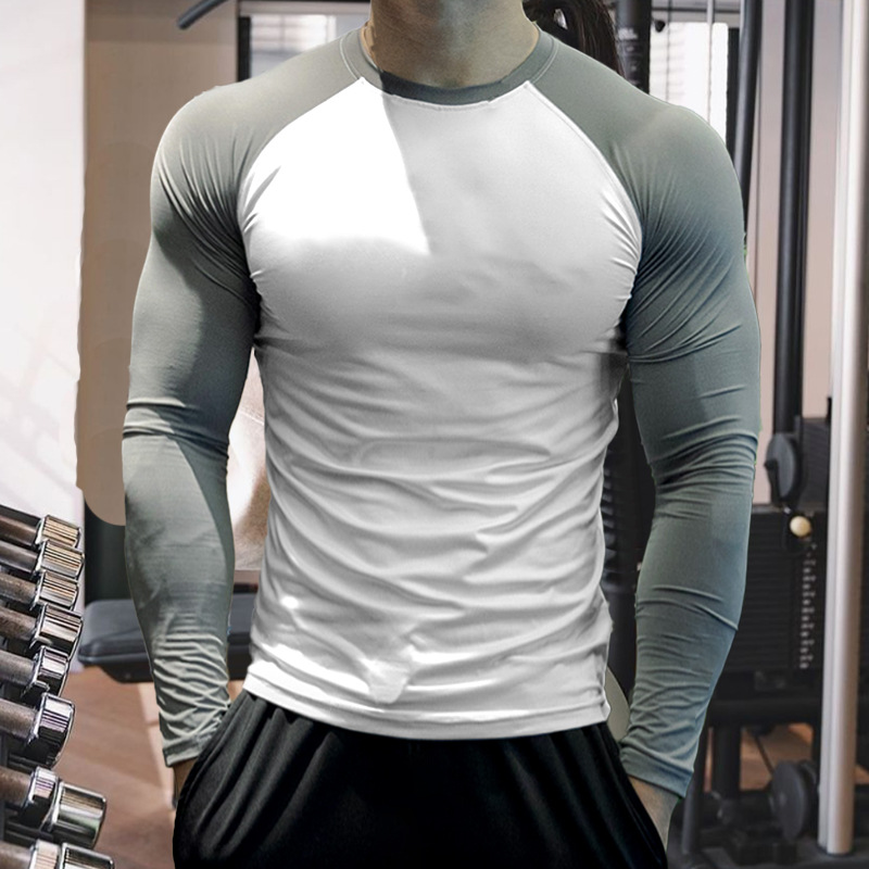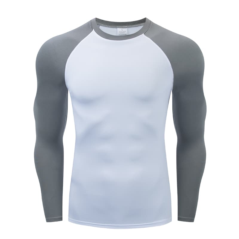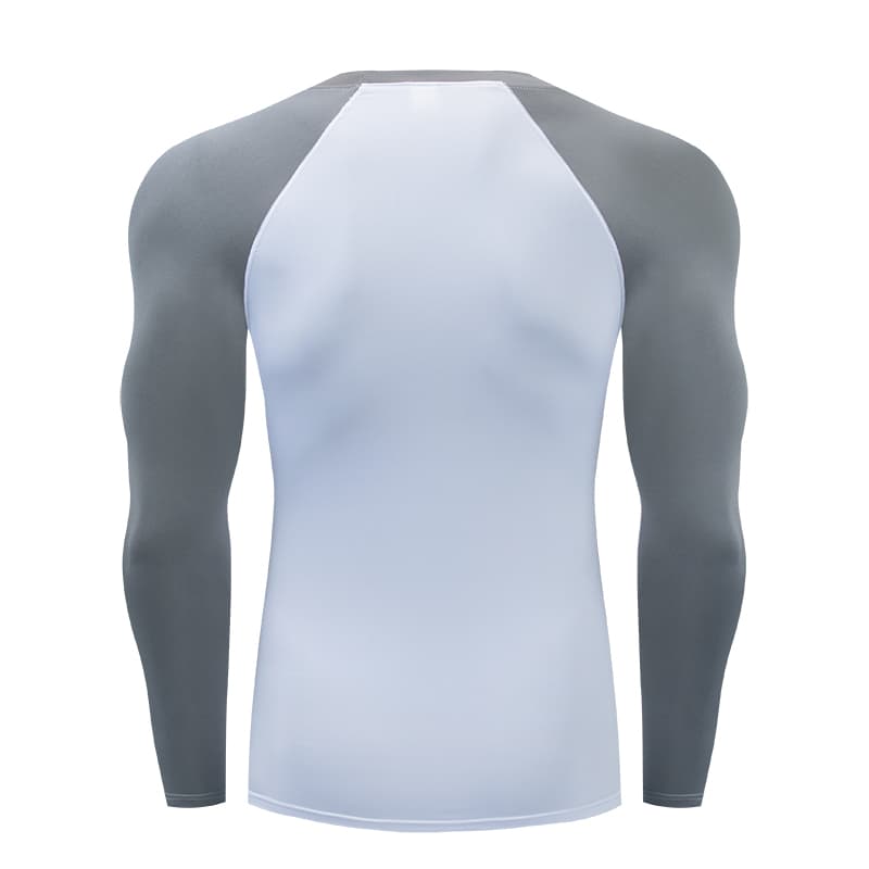 Рашгард чоловічий спортивний білого кольору із сірими рукавами, для занять активними видами спорту. Рашгард чоловічий спортивний біло-сірий шиється зі швидкої облягаючої тканини з легким компресійним ефектом.