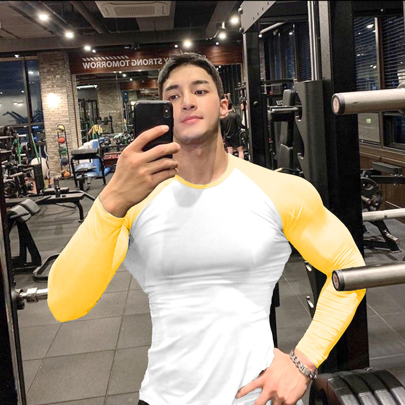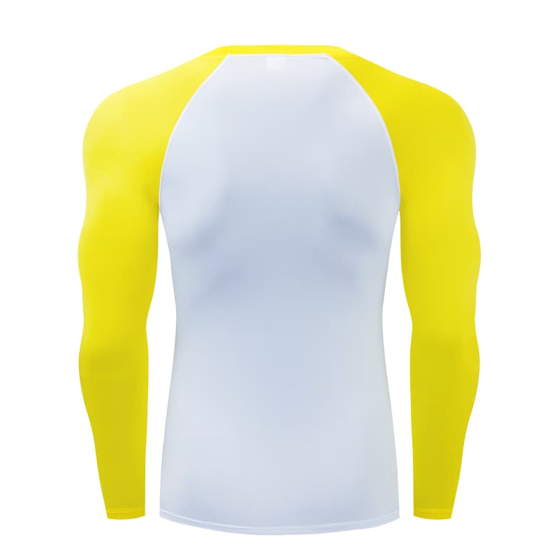 Рашгард чоловічий спортивний білого кольору із жовтими рукавами, для занять активними видами спорту. Рашгард чоловічий спортивний біло-жовтий шиється зі швидкої облягаючої тканини з легким компресійним ефектом.