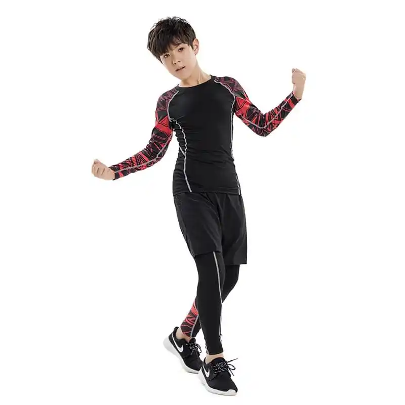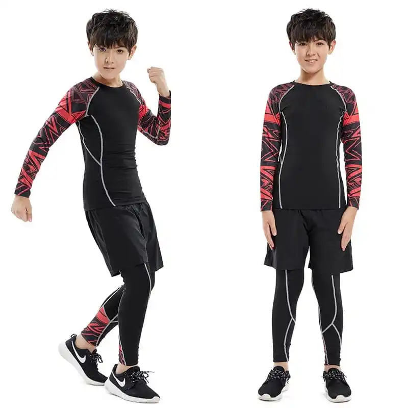 для занять фізкультурою та активними видами спорту. Чорного кольору з геометричним принтом червоного кольору на рукавах та стегнах. Костюм спортивний дитячий Red Power шиється зі швидковисихаючої тканини з легким компресійним ефектом. Підходить для будь-яких активних видів спорту: фітнесу, бігу, єдиноборств та інших. У комплект входять шорти, штани та рашгард.
