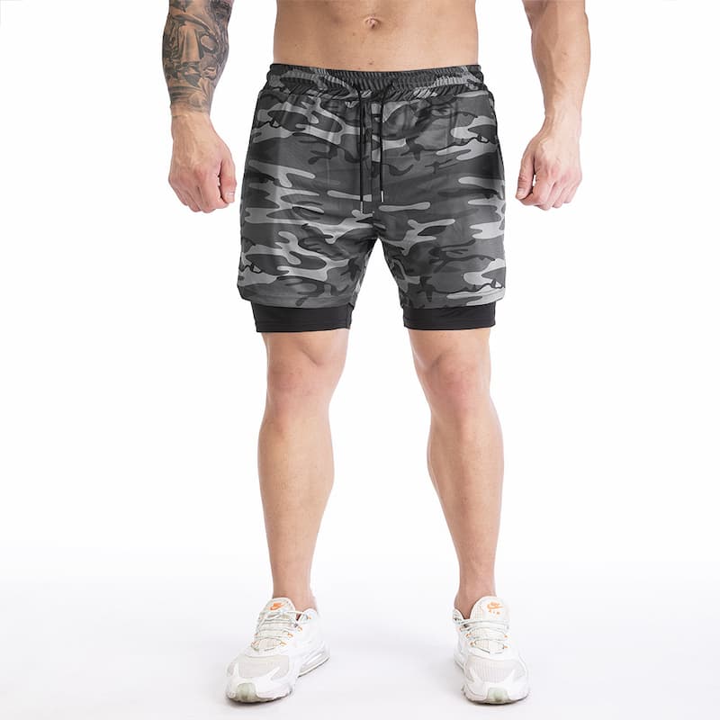Шорти спортивні MuscleMan камуфляж чорний підходять для силових видів спорту, а також фітнесу, бігу та інших. Складаються шорти з двох частин: зовнішньої – камуфляж чорних і сірих відтінків, із тканини з мікроперфорацією, і внутрішньої – чорного кольору, з облягаючої швидковисихаючої тканини. Підтримуються шорти широкою гумкою зі шнурком. На зовнішній частині шорт розташовуються дві бічні кишені та задня кишеня на блискавці. На внутрішній частині розташовується невидима, дуже зручна кишеня для смартфона.