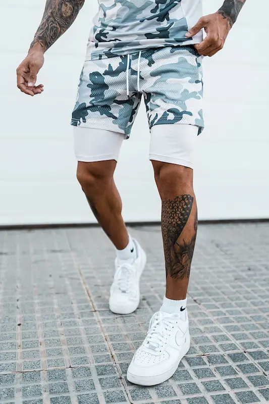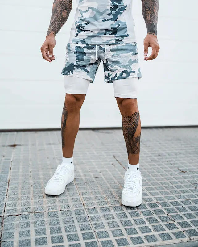 Шорти спортивні Hybrid підходять для силових видів спорту, а також фітнесу, бігу та інших. Складаються шорти з двох частин: зовнішньої – камуфльованого забарвлення з плямами зелених відтінків на білому тлі, і внутрішньої – білого кольору, з облягаючої швидковисихаючої тканини. Підтримуються шорти широкою гумкою зі шнурком. На зовнішній частині шорт розташовуються дві бічні кишені.