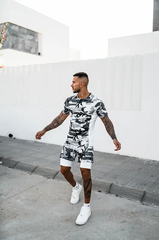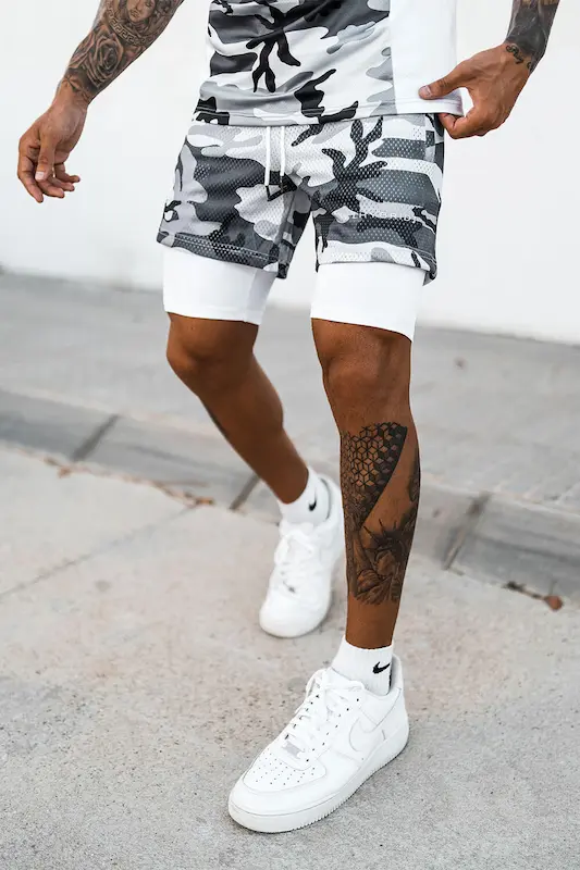 Шорти спортивні Hybrid підходять для силових видів спорту, а також фітнесу, бігу та інших. Складаються шорти з двох частин: зовнішньої – камуфльованого забарвлення з чорними, сірими і білими плямами, і внутрішньої – білого кольору, з облягаючої швидковисихаючої тканини. Підтримуються шорти широкою гумкою зі шнурком. На зовнішній частині шорт розташовуються дві бічні кишені.