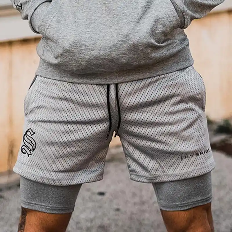Шорти спортивні Hybrid підходять для силових видів спорту, а також фітнесу, бігу та інших. Складаються шорти з двох частин: зовнішньої – сірого кольору, з тканини з мікроперфорацією, і внутрішньої – також сірого кольору, з облягаючої швидковисихаючої тканини. Підтримуються шорти широкою гумкою зі шнурком. На зовнішній частині шорт розташовуються дві бічні кишені.