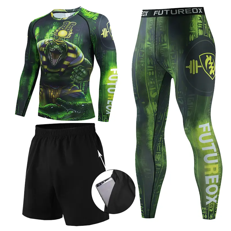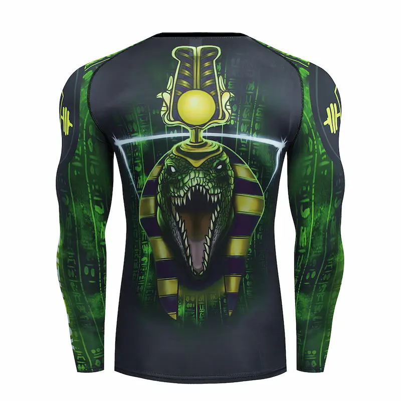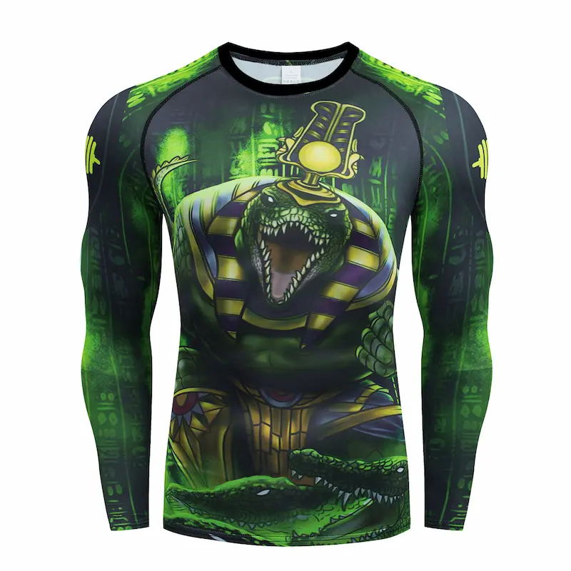 Рашгард та тайтси чорного та різних відтінків зеленого кольорів із зображенням крокодила-фараона на спині та грудях. Тайтси з широким поясом, зеленого кольору різних відтінків. Костюм чоловічий Crocodile King шиється зі швидковисихаючої компресійної тканини. Підходить для силових видів спорту, а також для фітнесу, бігу, єдиноборств та інших. У комплект входять шорти, штани та рашгард.