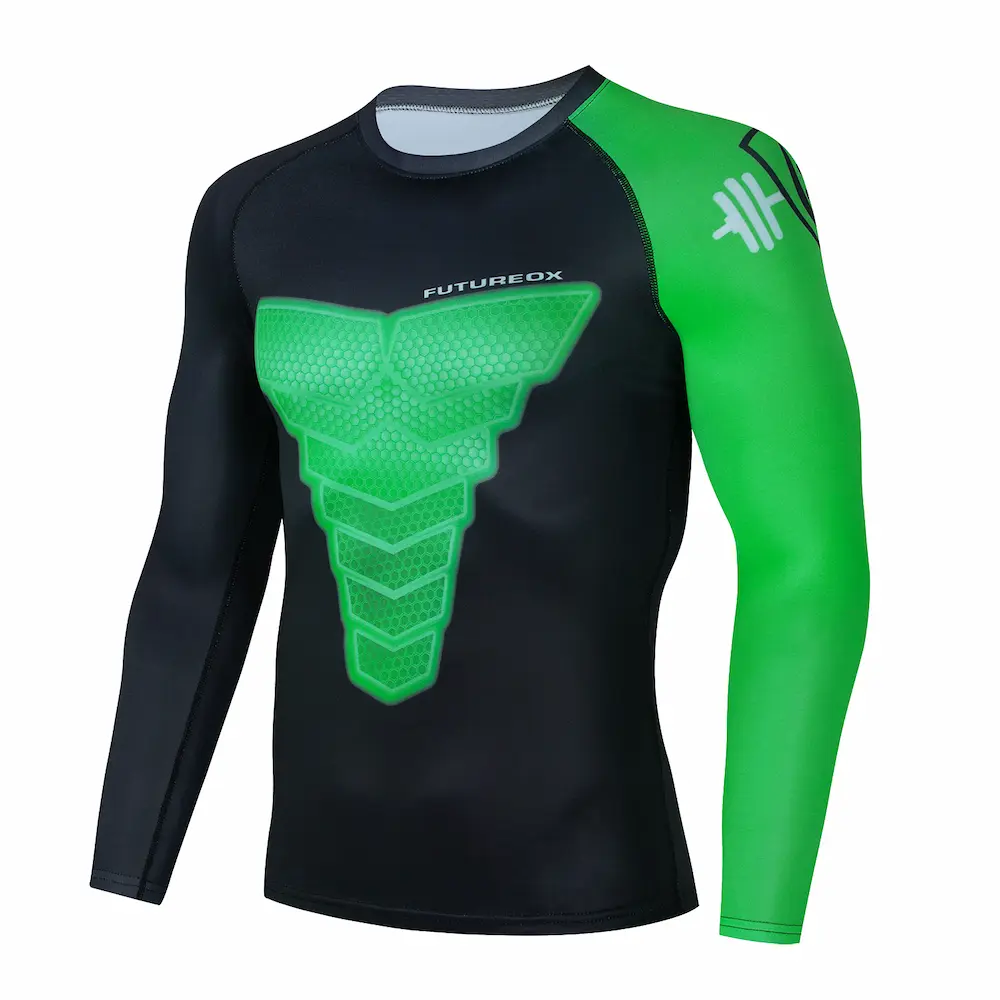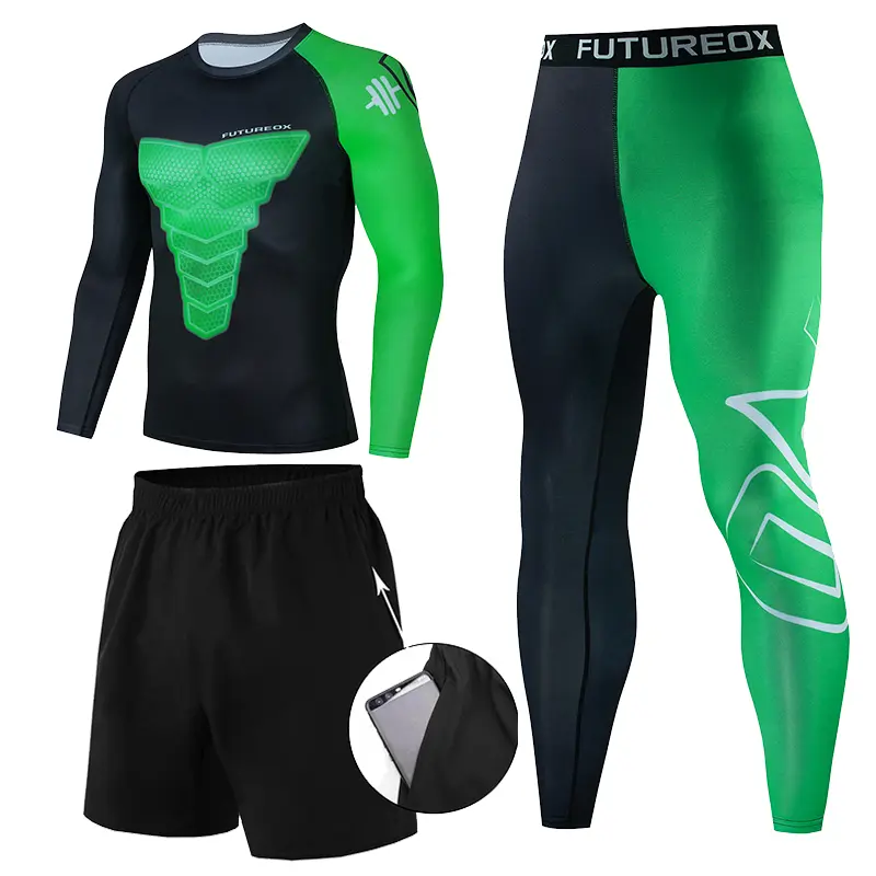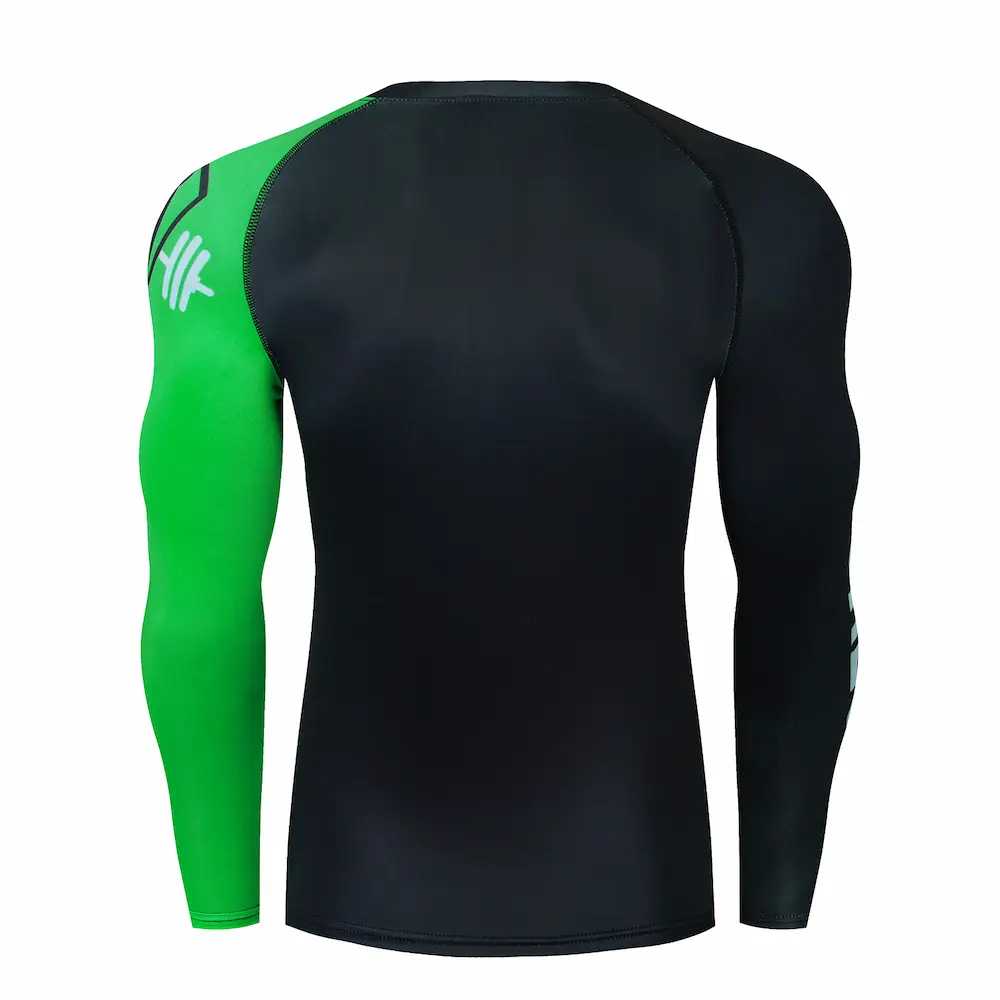 Рашгард та тайтси чорного кольору із зеленою емблемою на грудях, лівий рукав та ліва штанина також зеленого кольору. Тайтси з широким поясом. Костюм чоловічий GreenHammer шиється зі швидковисихаючої компресійної тканини. Підходить для силових видів спорту, а також для фітнесу, бігу, єдиноборств та інших. У комплект входять шорти, штани та рашгард.