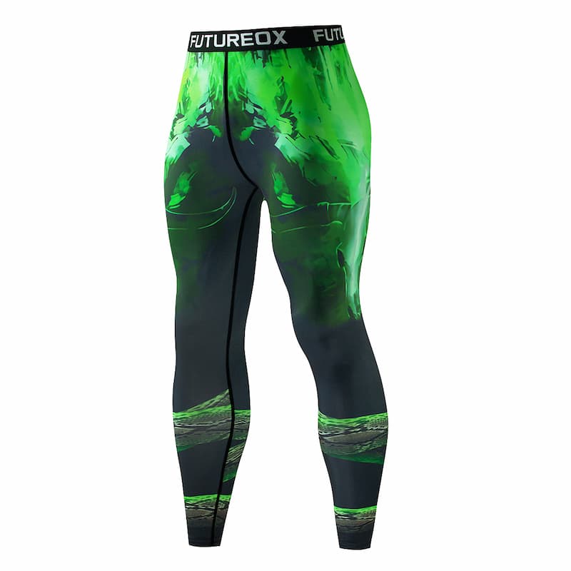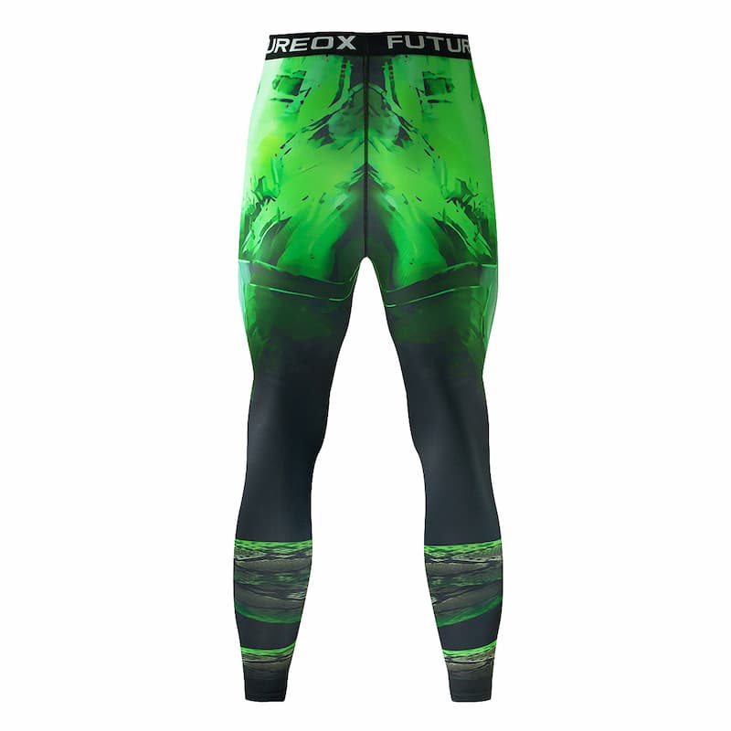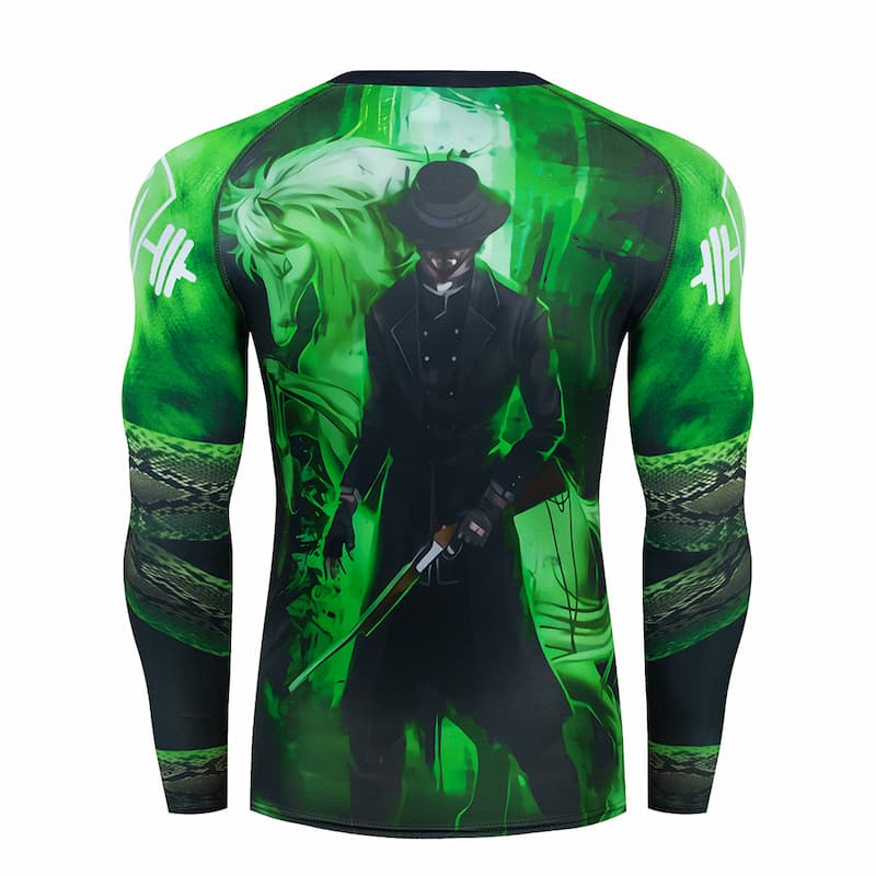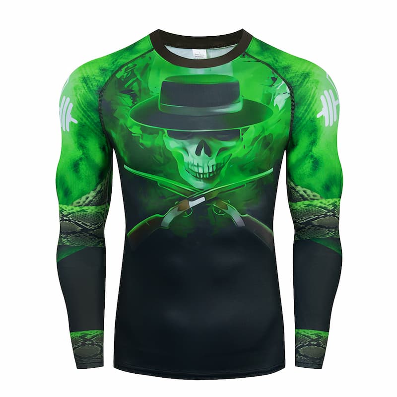 Рашгард та тайтси чорного, сірого та зеленого кольорів із зображенням черепа в капелюсі на грудях. Тайтси з широким поясом. Костюм чоловічий Green Snake шиється зі швидковисихаючої компресійної тканини. Підходить для силових видів спорту, а також для фітнесу, бігу, єдиноборств та інших. У комплект входять шорти, штани та рашгард.