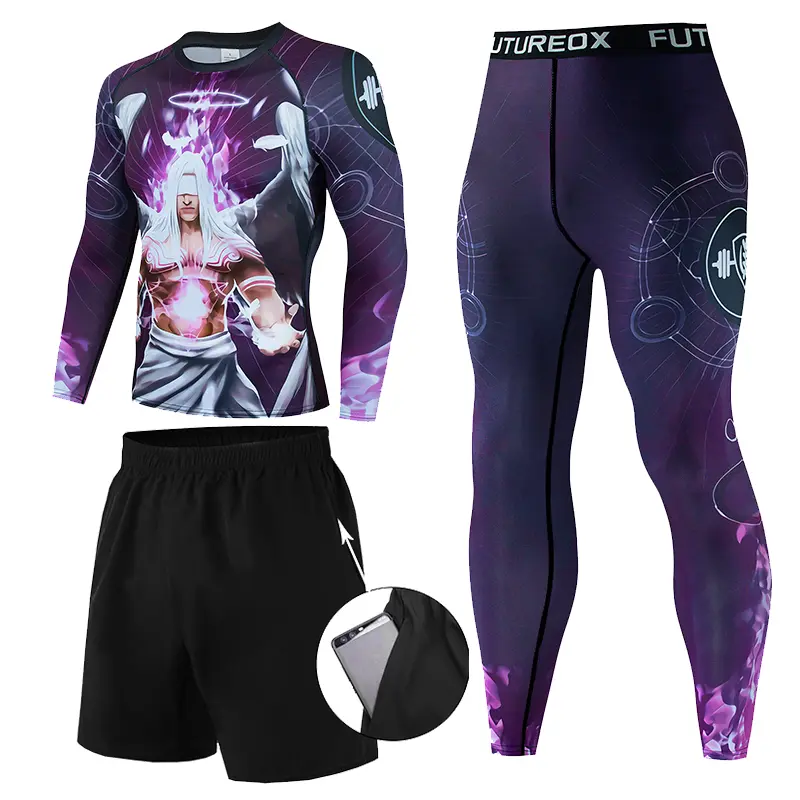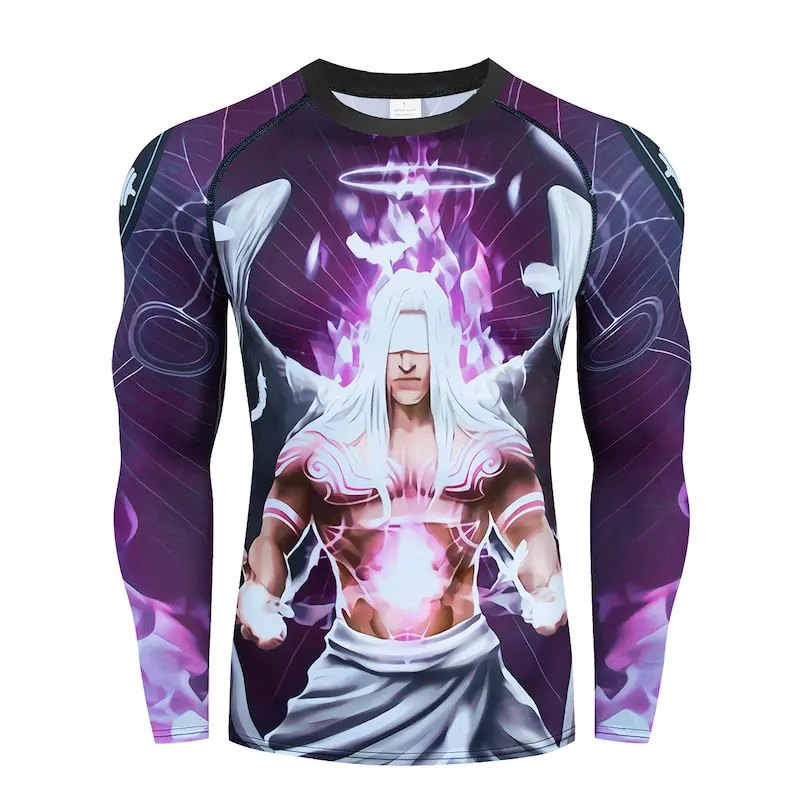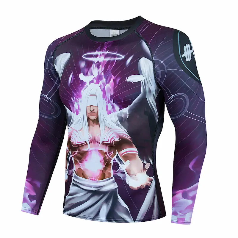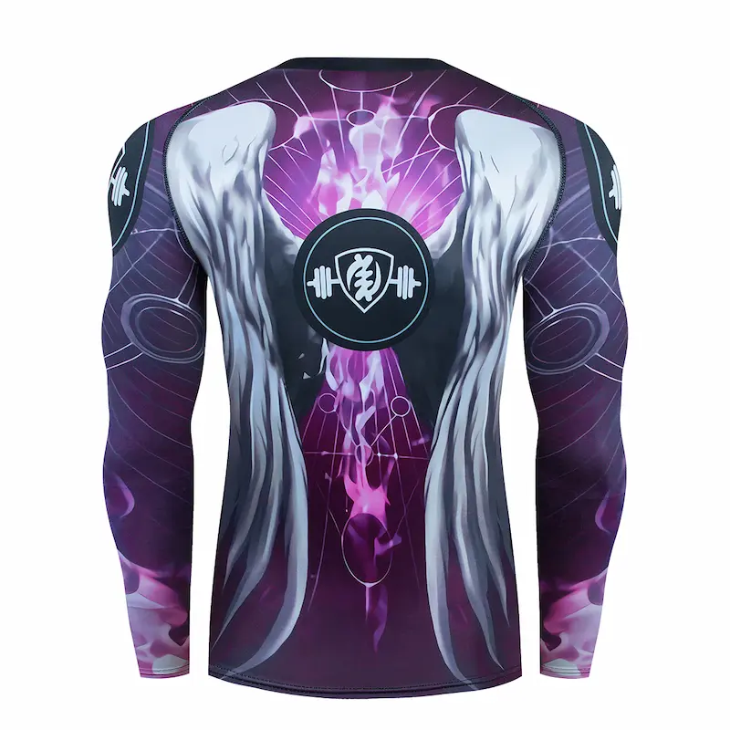 Рашгард та тайтси різних відтінків синього та фіолетового кольорів із зображенням ангела сили на спині та грудях. Тайтси з широким чорним поясом. Костюм чоловічий Power Angel шиється зі швидковисихаючої компресійної тканини. Підходить для силових видів спорту, а також для фітнесу, бігу, єдиноборств та інших. У комплект входять шорти, штани та рашгард.
