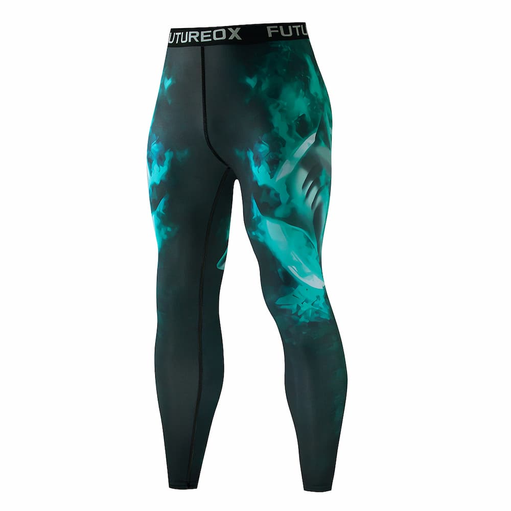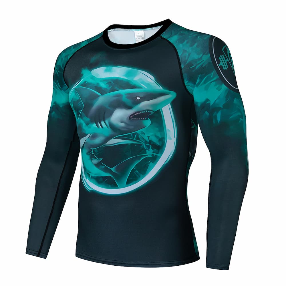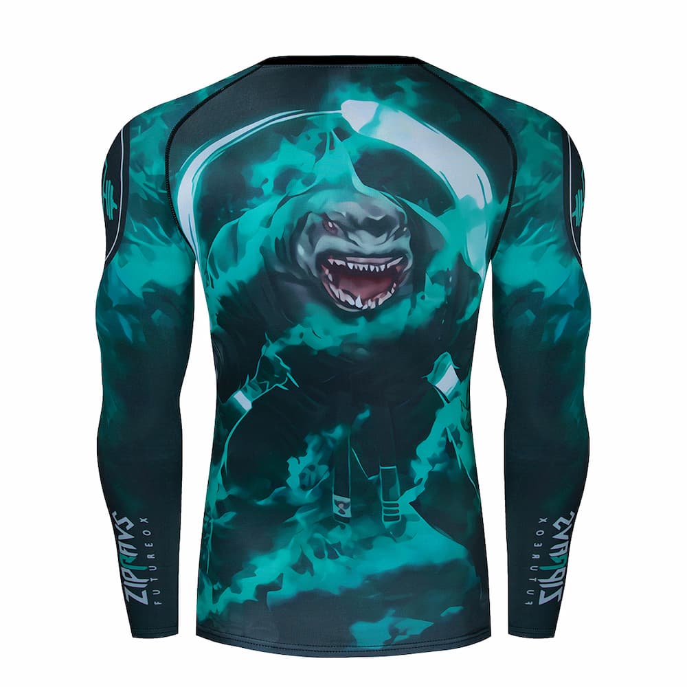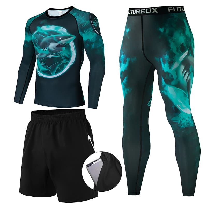 Рашгард та тайтси чорного та різних відтінків лилового кольорів із зображенням величезної акули на грудях та спині. Тайтси з широким поясом. Костюм чоловічий TheMeg шиється зі швидковисихаючої компресійної тканини. Підходить для силових видів спорту, а також для фітнесу, бігу, єдиноборств та інших. У комплект входять шорти, штани та рашгард.