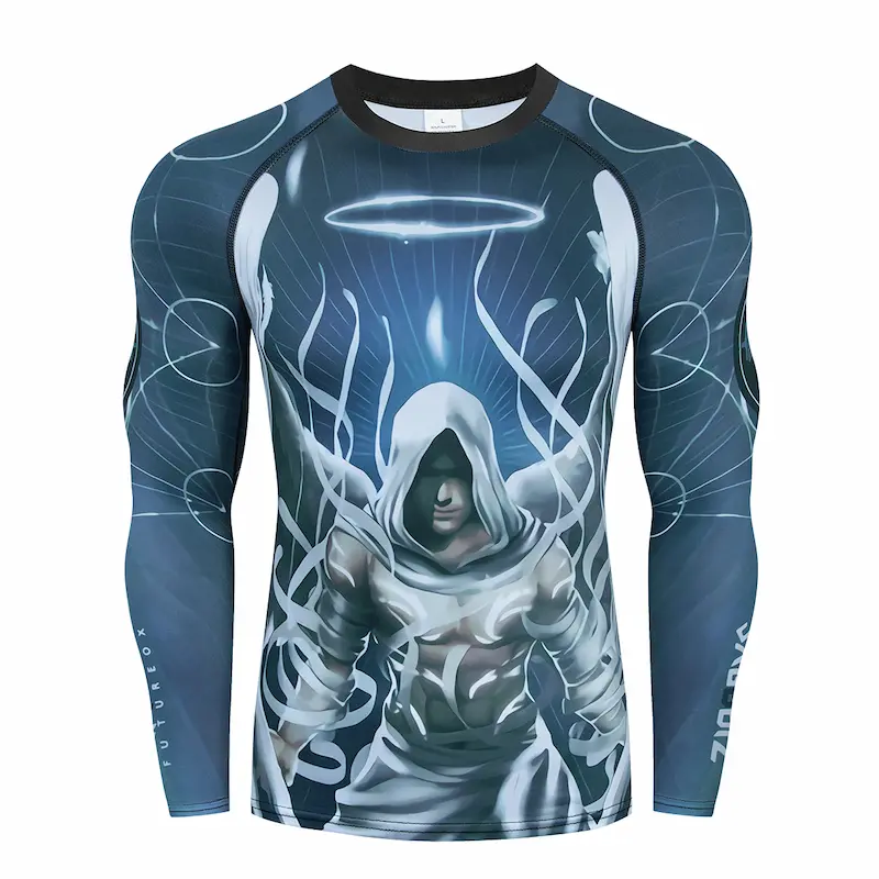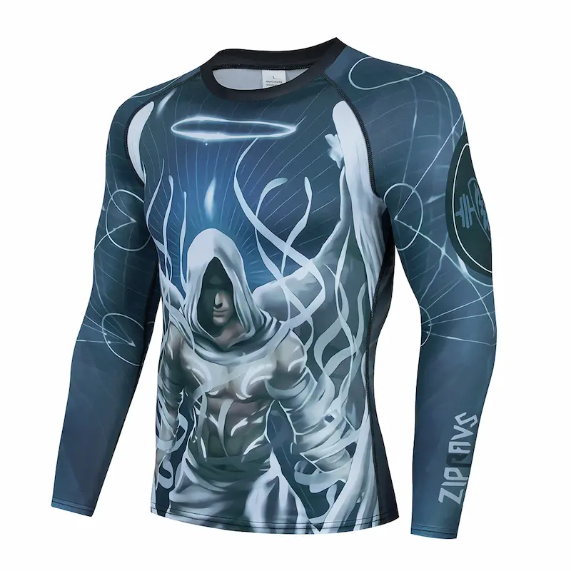 Рашгард та тайтси різних відтінків сірого та лілового кольорів із зображенням білого ангела з крилами на спині та грудях. Тайтси з широким поясом, лілового кольору різних відтінків. Костюм чоловічий White Angel шиється зі швидковисихаючої компресійної тканини. Підходить для силових видів спорту, а також для фітнесу, бігу, єдиноборств та інших. У комплект входять шорти, штани та рашгард.