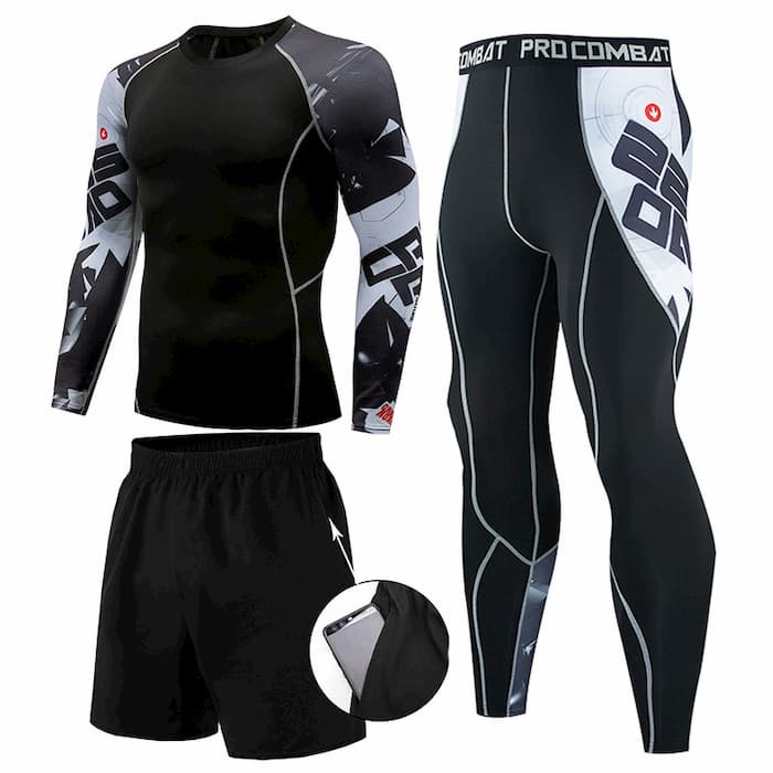 Рашгард і тайтси чорного кольору з білими вставками на рукавах та стегнах. Шорти з карманами, чорного кольору. Костюм чоловічий CrossRoad шиється зі швидковисихаючої компресійної тканини. Підходить для силових видів спорту, а також для фітнесу, бігу, єдиноборств та інших. У комплект входять шорти, штани та рашгард.