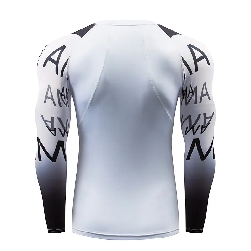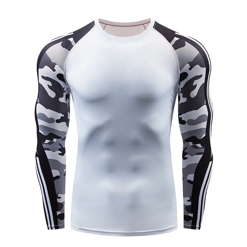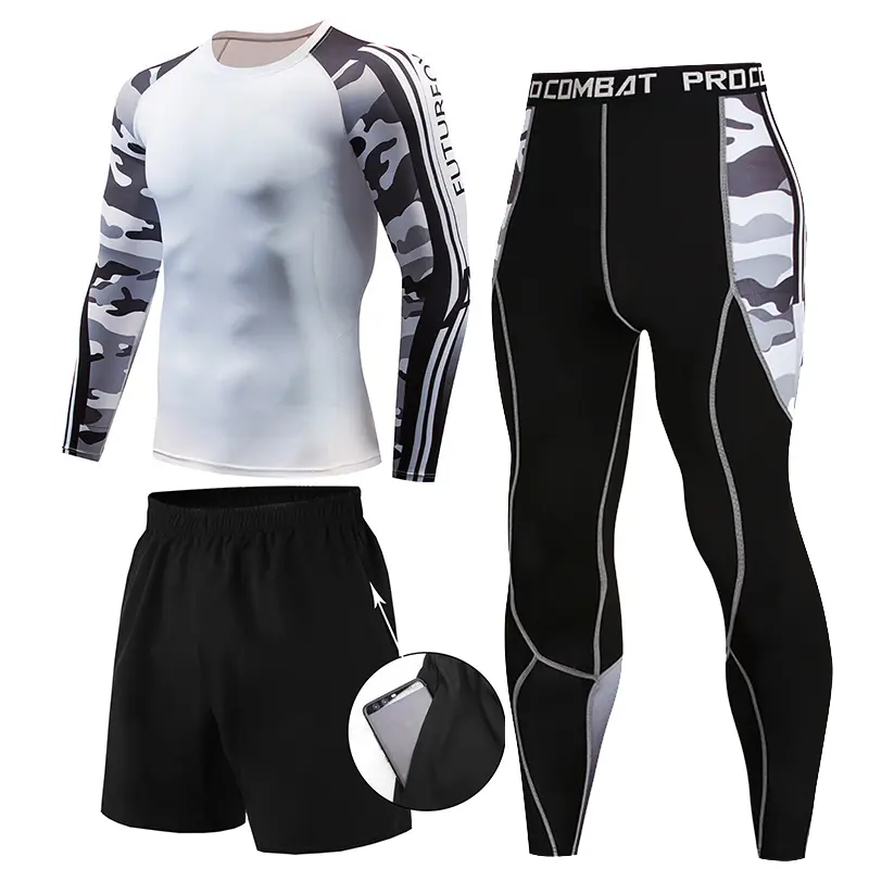 Рашгард білого, штани чорного кольору з камуфльованим принтом сірого і білого кольорів на рукавах і стегнах. Костюм чоловічий Feature шиється зі швидковисихаючої компресійної тканини. Підходить для силових видів спорту, а також для фітнесу, бігу, єдиноборств та інших. У комплект входять шорти, штани та рашгард.