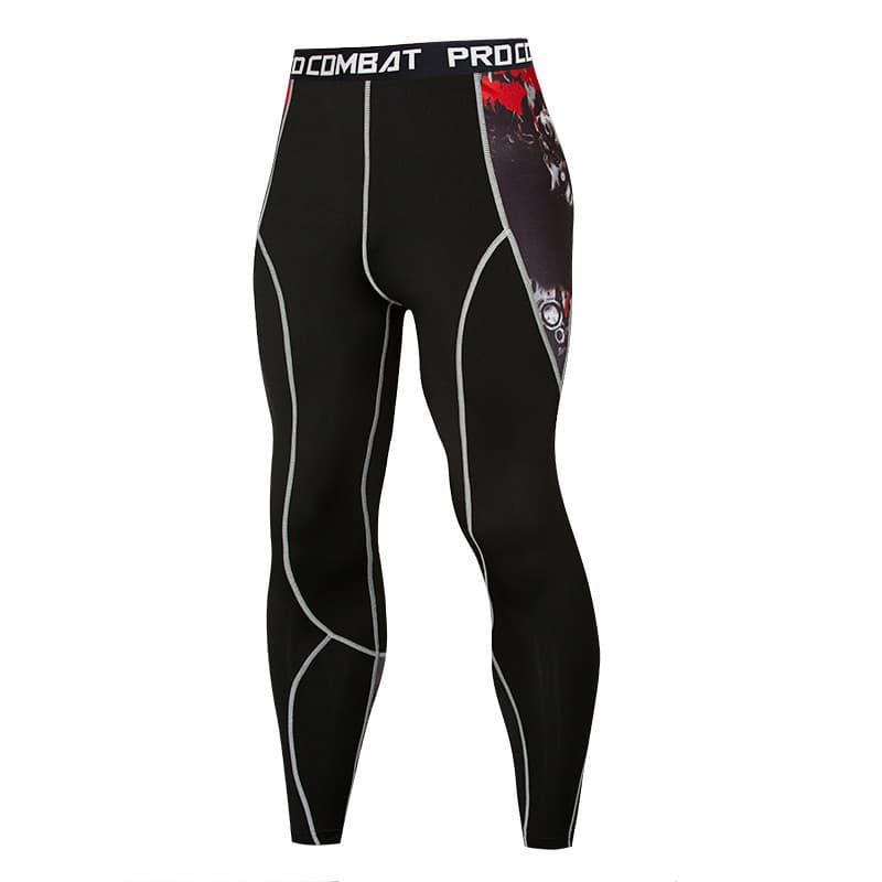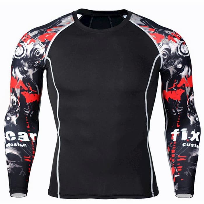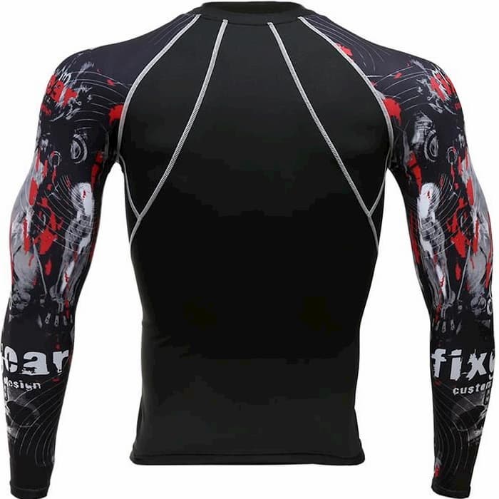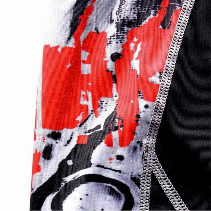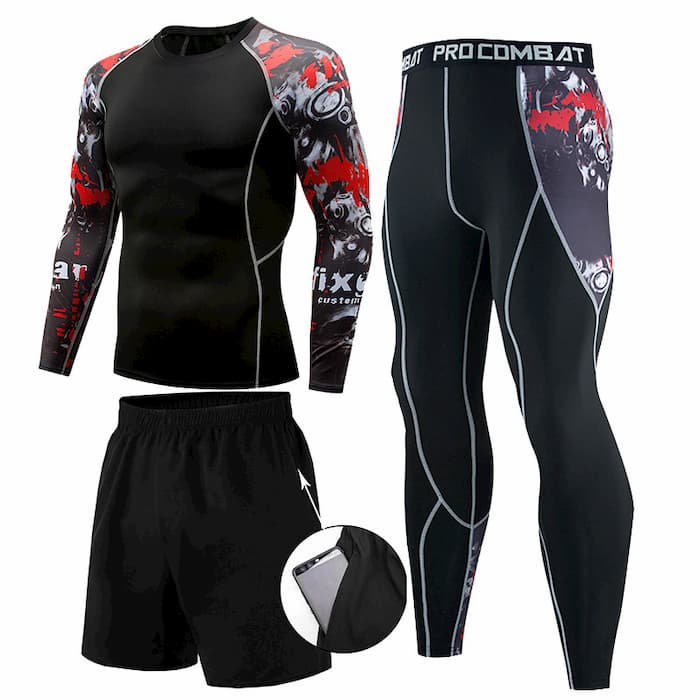 Рашгард і тайтси чорного кольору з принтом червоного та білого кольору на рукавах та стегнах. Шорти з карманами, чорного кольору. Костюм чоловічий FixGear шиється зі швидковисихаючої компресійної тканини. Підходить для силових видів спорту, а також для фітнесу, бігу, єдиноборств та інших. У комплект входять шорти, штани та рашгард.