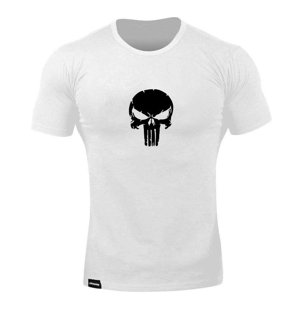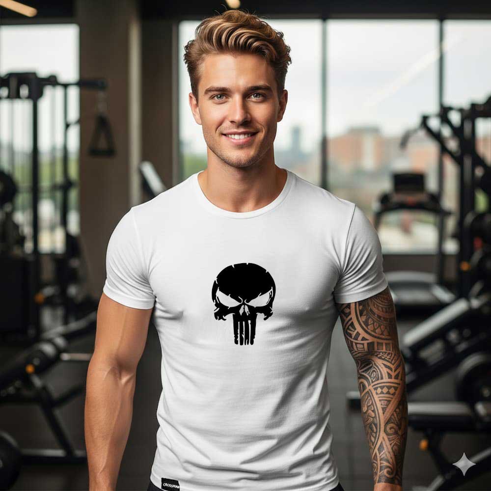 Футболка чоловіча Каратель білого кольору, приталений крій (Slim Fit), відзначається високою якістю та комфортом завдяки поєднанню натуральної бавовни та спандексу. На грудях футболки розміщен стилізований принт “Каратель” чорного кольору, що додає їй унікального вигляду та підкреслює ваш смак.