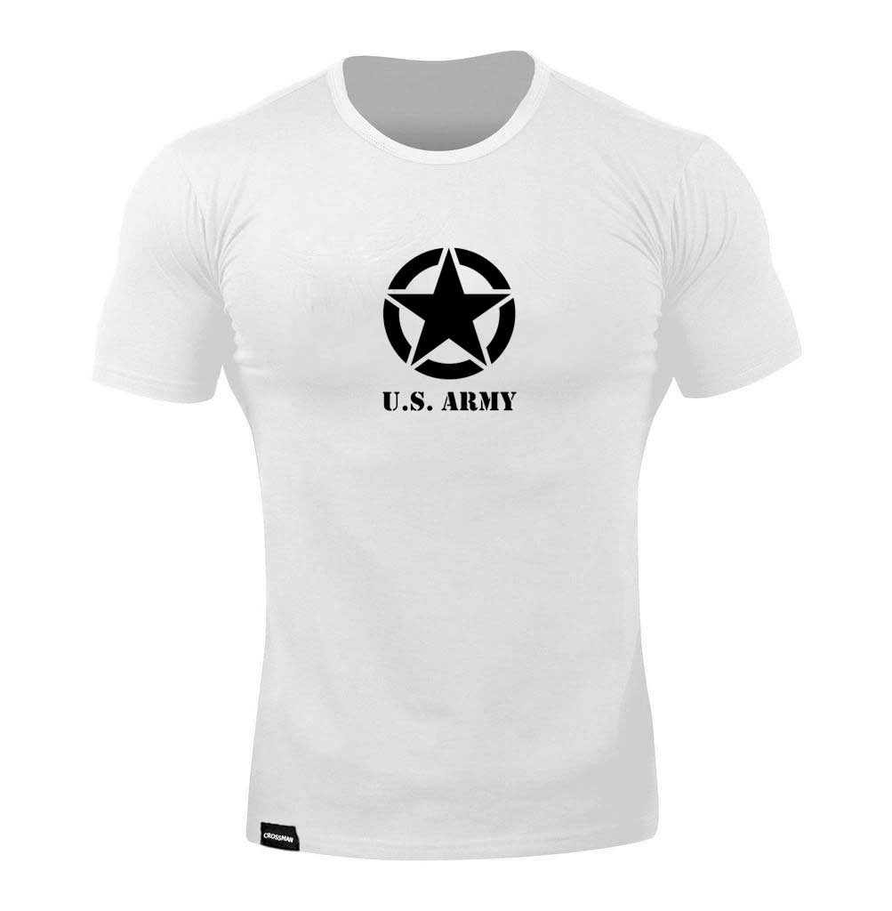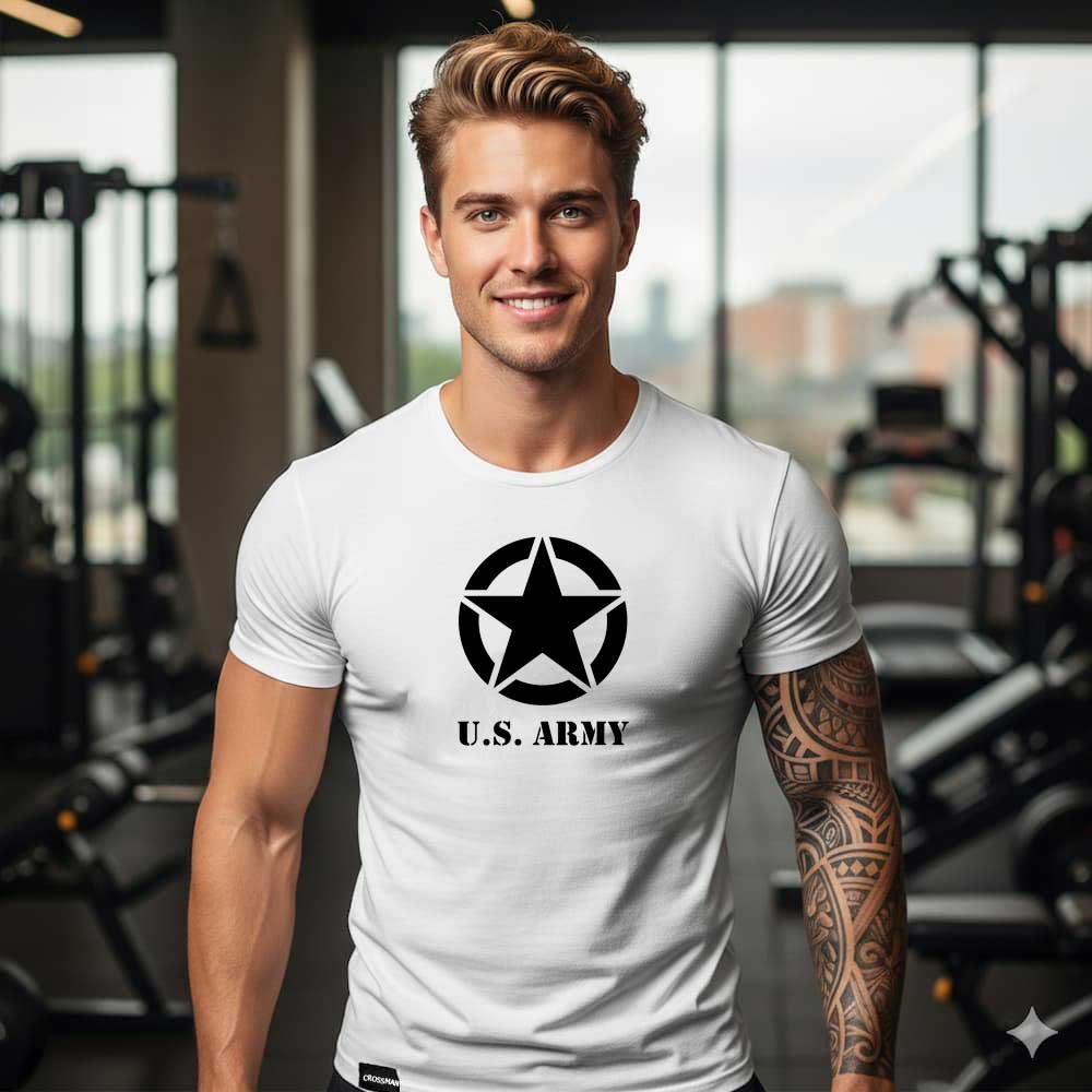 Футболка чоловіча U.S. Army Star білого кольору, приталений крій (Slim Fit), відзначається високою якістю та комфортом завдяки поєднанню натуральної бавовни та спандексу. На грудях футболки розміщен стилізований принт “U.S. Army Star” чорного кольору, що додає їй унікального вигляду та підкреслює ваш смак.